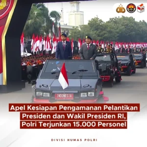 Polri menggelar Apel Kesiapan Pengamanan Sumpah Presiden dan Wakil Presiden RI di Mako Korbrimob Polri, Kelapa Dua, Depok, Jawa Barat, Senin (14/10). Apel tersebut dipimpin langsung oleh Presiden RI Ir. H. Joko Widodo. Sebanyak 15.000 pasukan Korps Bhayangkara diterjunkan untuk memastikan kambtimas dalam kondisi yang kondusif. Pada kesempatan yang sama, tujuh satuan kerja Polri menerima tanda kehormatan “Nugraha Sakanti” yakni penghargaan atas jasa di bidang Kepolisian yang bermanfaat bagi bangsa dan negara. Melalui apel gelar pasukan ini, Polri menjamin kelancaran pengambilan sumpah Presiden dan Wakil Presiden RI yang akan dilaksanakan pada 20 Oktober 2024 mendatang. Penyematan Tanda Kehormatan #LokaPrajaSamrakshana